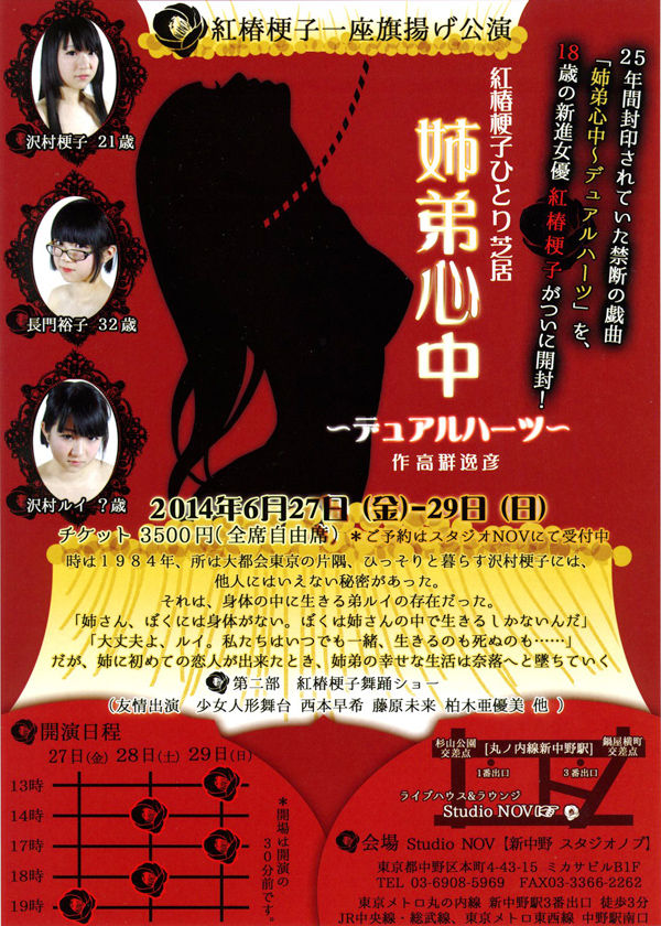 今日6月27日金曜日、新中野のライブハウスNOVで、「紅椿梗子一座」旗揚げ公演「姉弟心中〜デュアルハーツ〜」を見に行った。