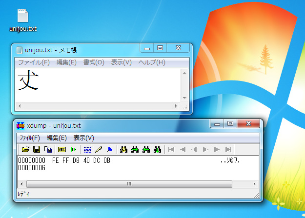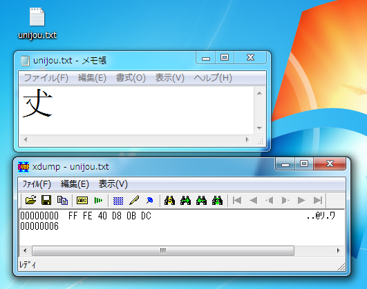 上から、保存したファイルのアイコン、それを「メモ帳」で開いたもの、それをフリーウェアの16進ダンプ用ソフトウェア「xdump」(リンクはベクター)で開いたものである。