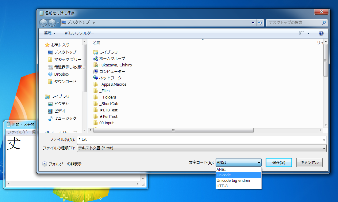 まず、Windows付属のメモ帳に𠀋をコピペして「名前を付けて保存」を選び「文字コード」を選択する。