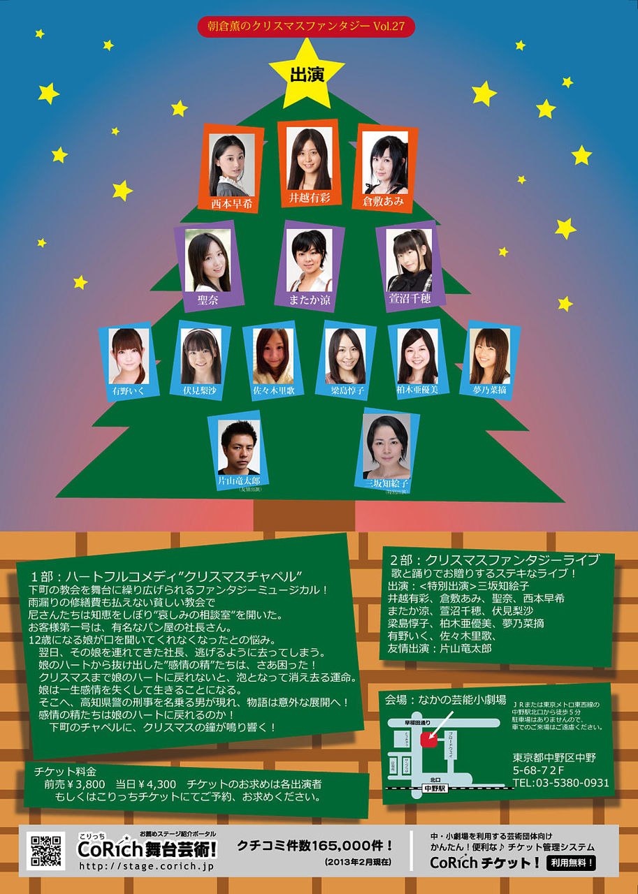 2013年12月21日土曜日、なかの芸能小劇場に「朝倉薫演劇団第27回クリスマス公演 クリスマスチャペル&ファンタジーライブ」を観てきた。