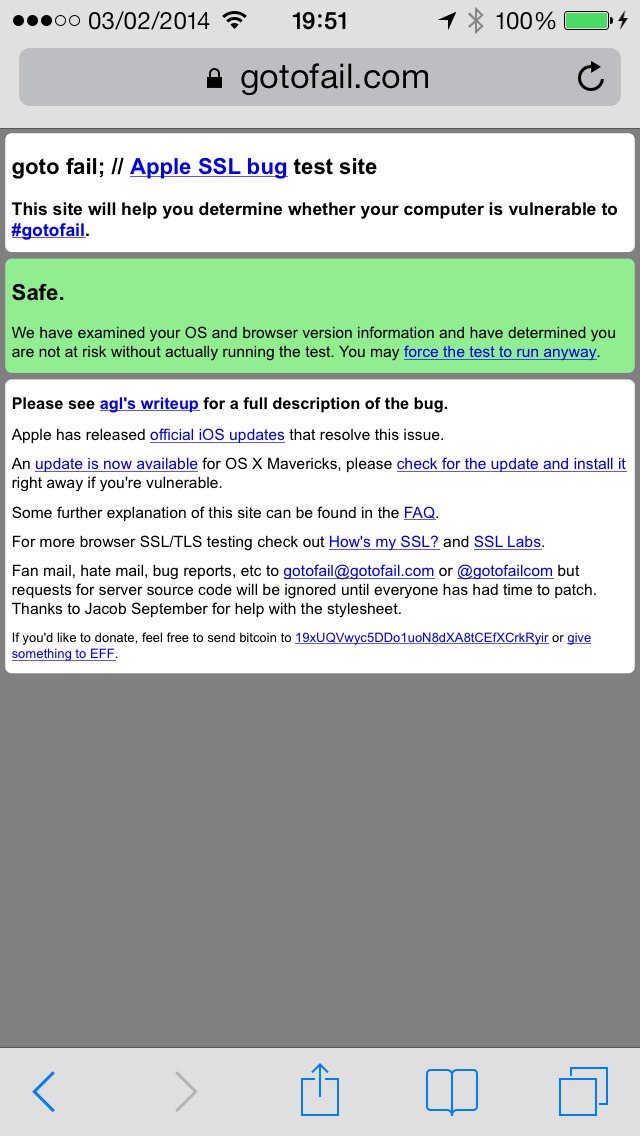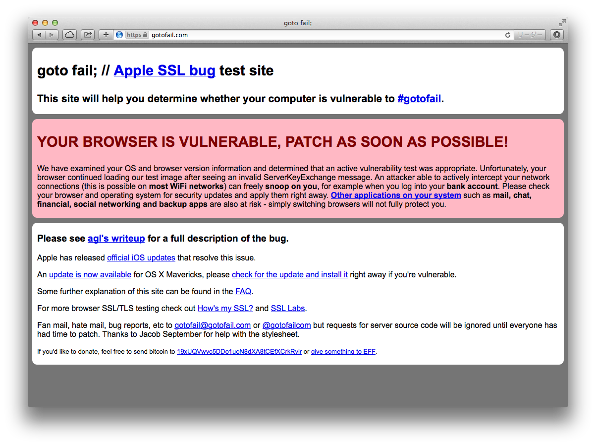さて、この脆弱性があるかどうかは、https://gotofail.com/というサイトを見に行けばわかることになっている。