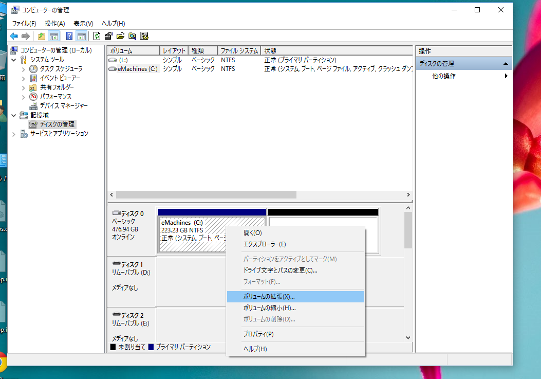 これはWindows 10の「コンピューターの管理」ツールでパーティションを変更する。
