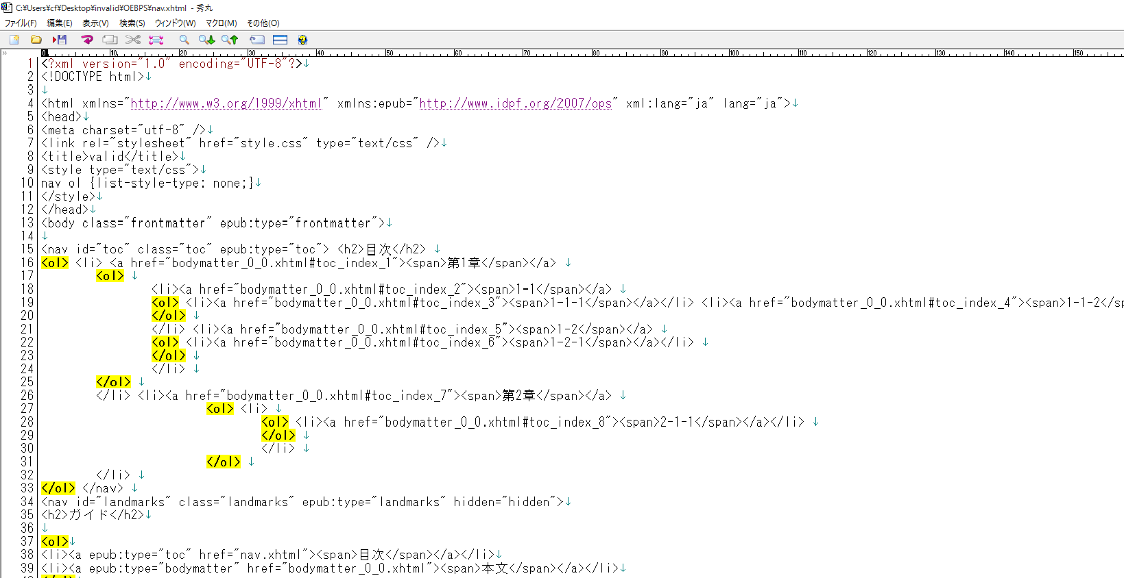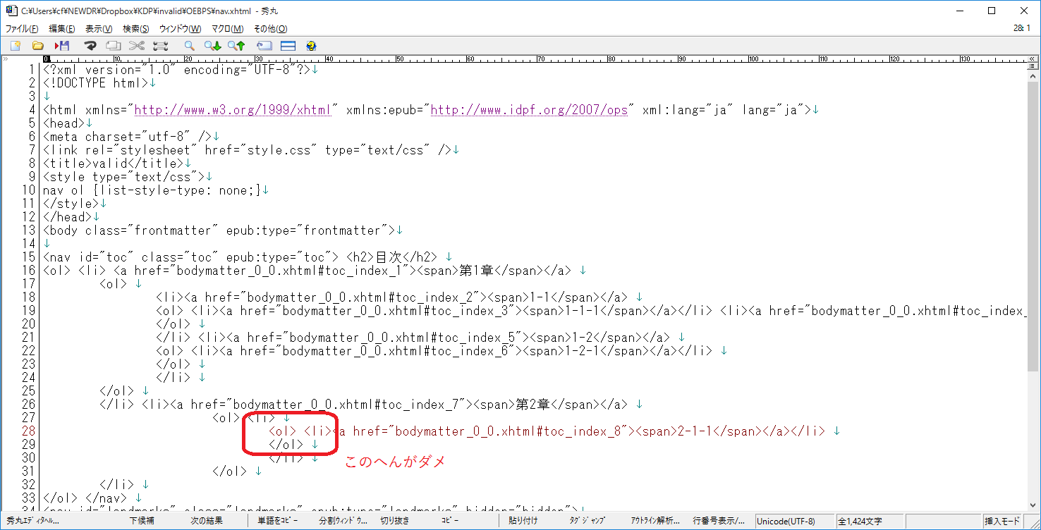 具体的には、epubをunzipしたフォルダーの中で(下ではinvalidとする)